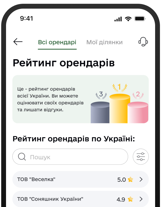 Можливість оцінювати свого орендаря та лишати відгук про співпрацю з ним, а також моніторити оцінки інших орендарів.